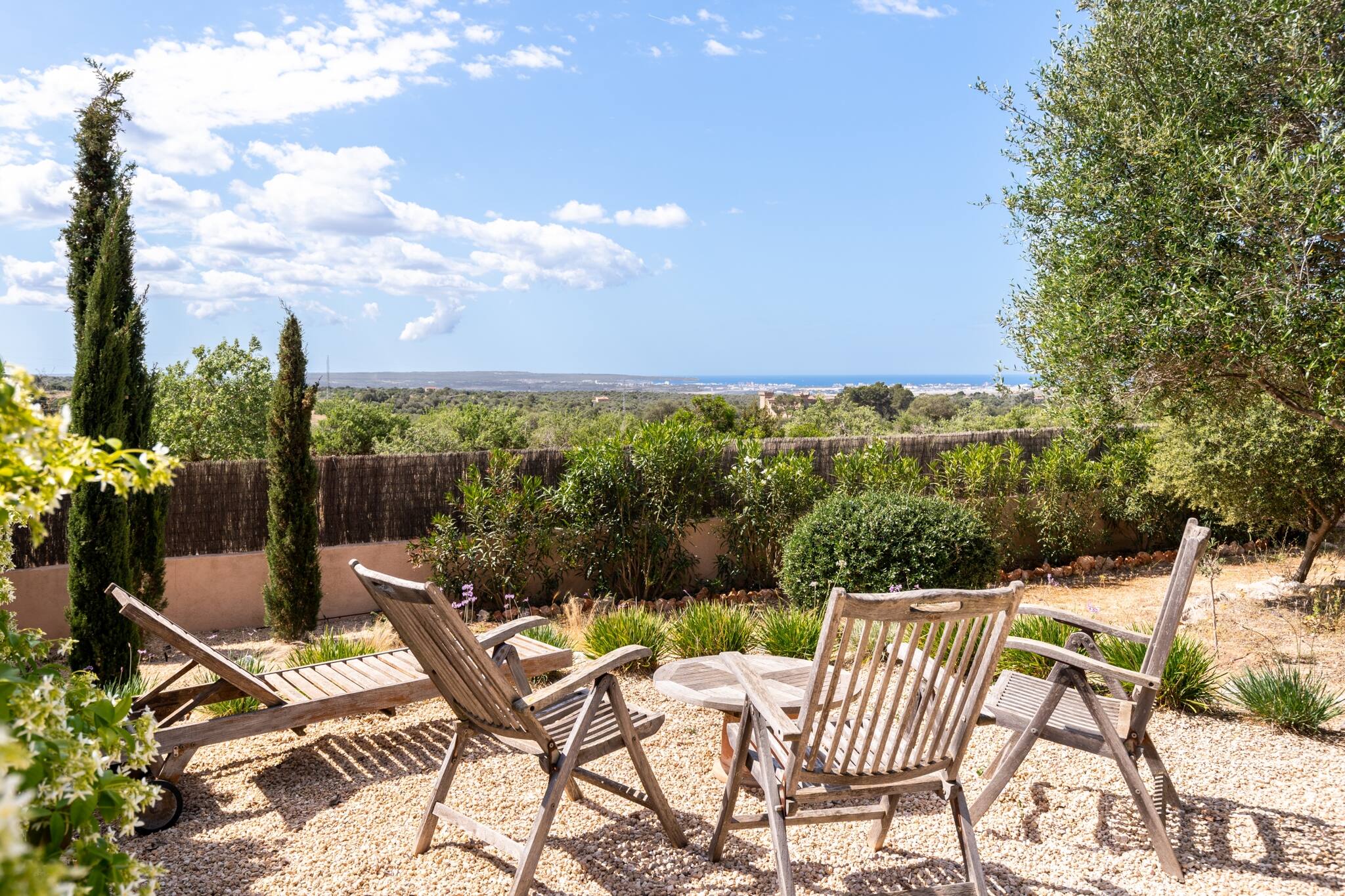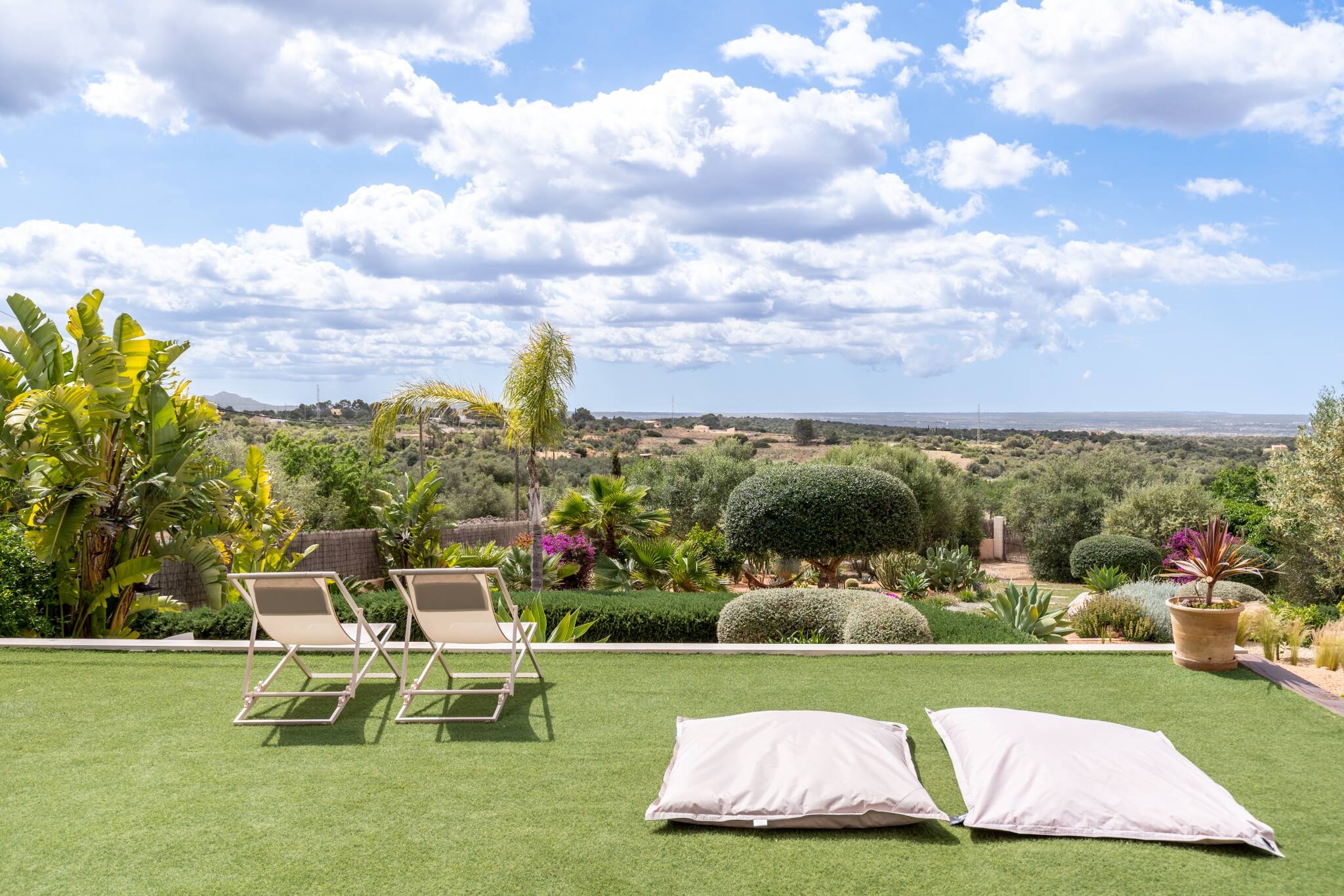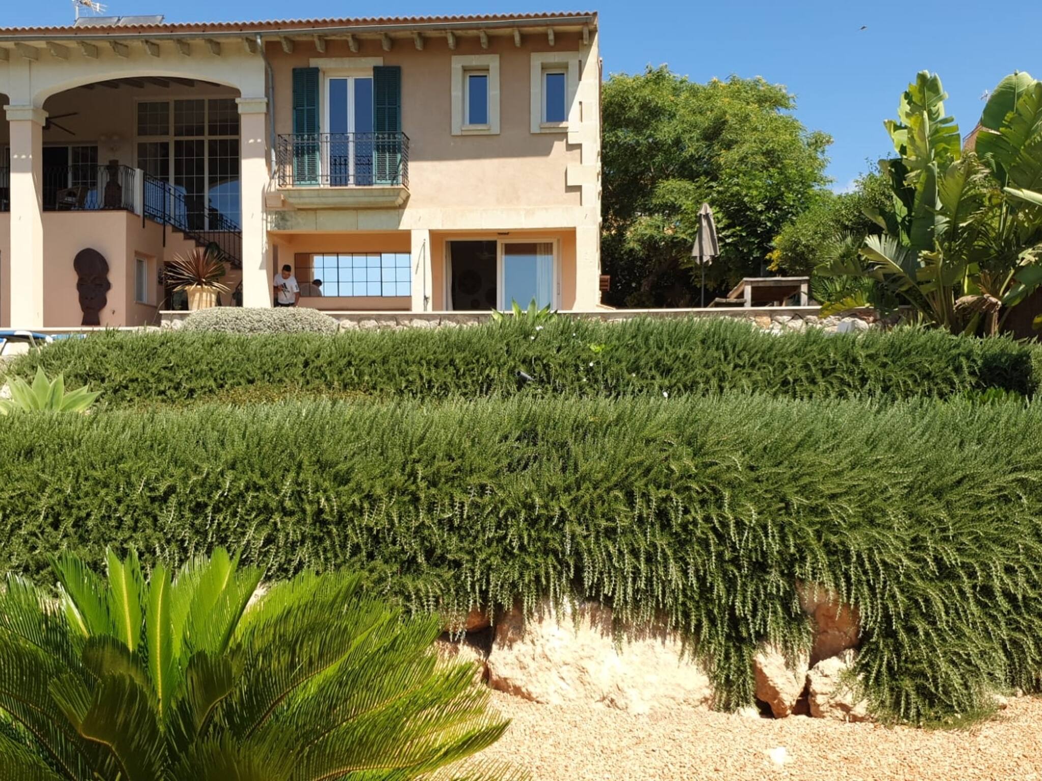 El exuberante jardín mediterráneo de buen tamaño ofrece suficiente espacio para la recreación y la relajación. Maravillosa piscina privada, con vistas estupendas a la bahía de Palma. Barbacoa de gas y también grill de leña, comedor de exterior. La zona de terraza cuenta además con hamacas y tumbonas.