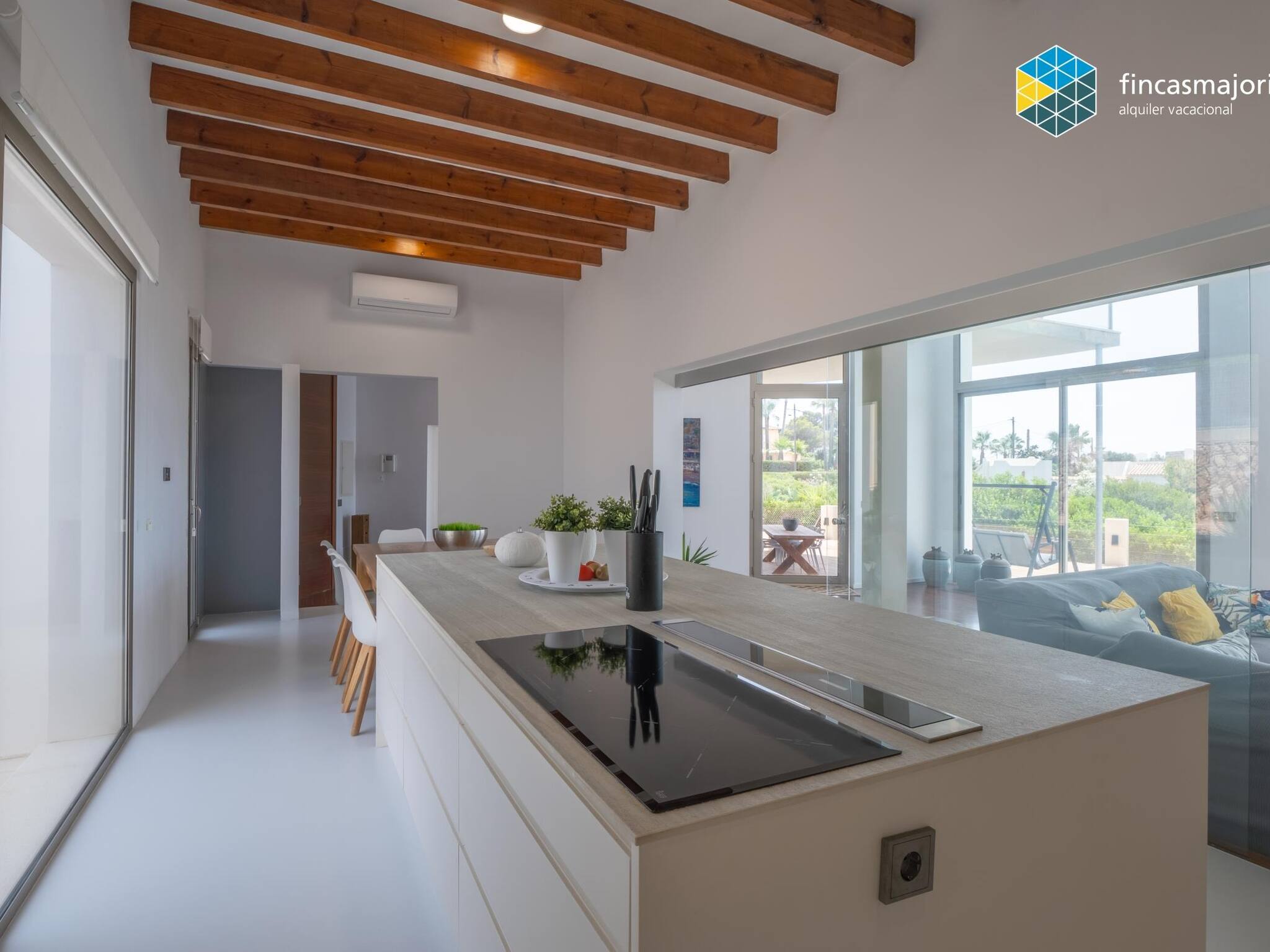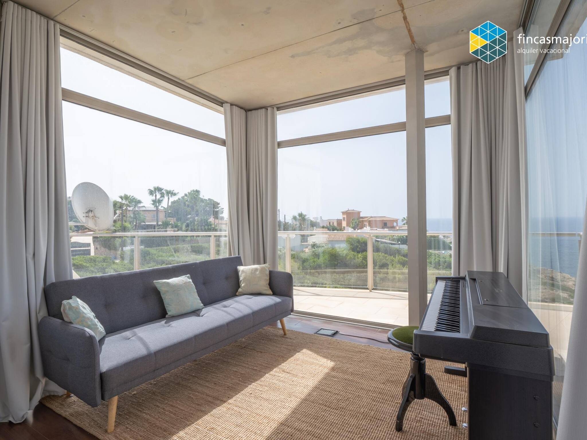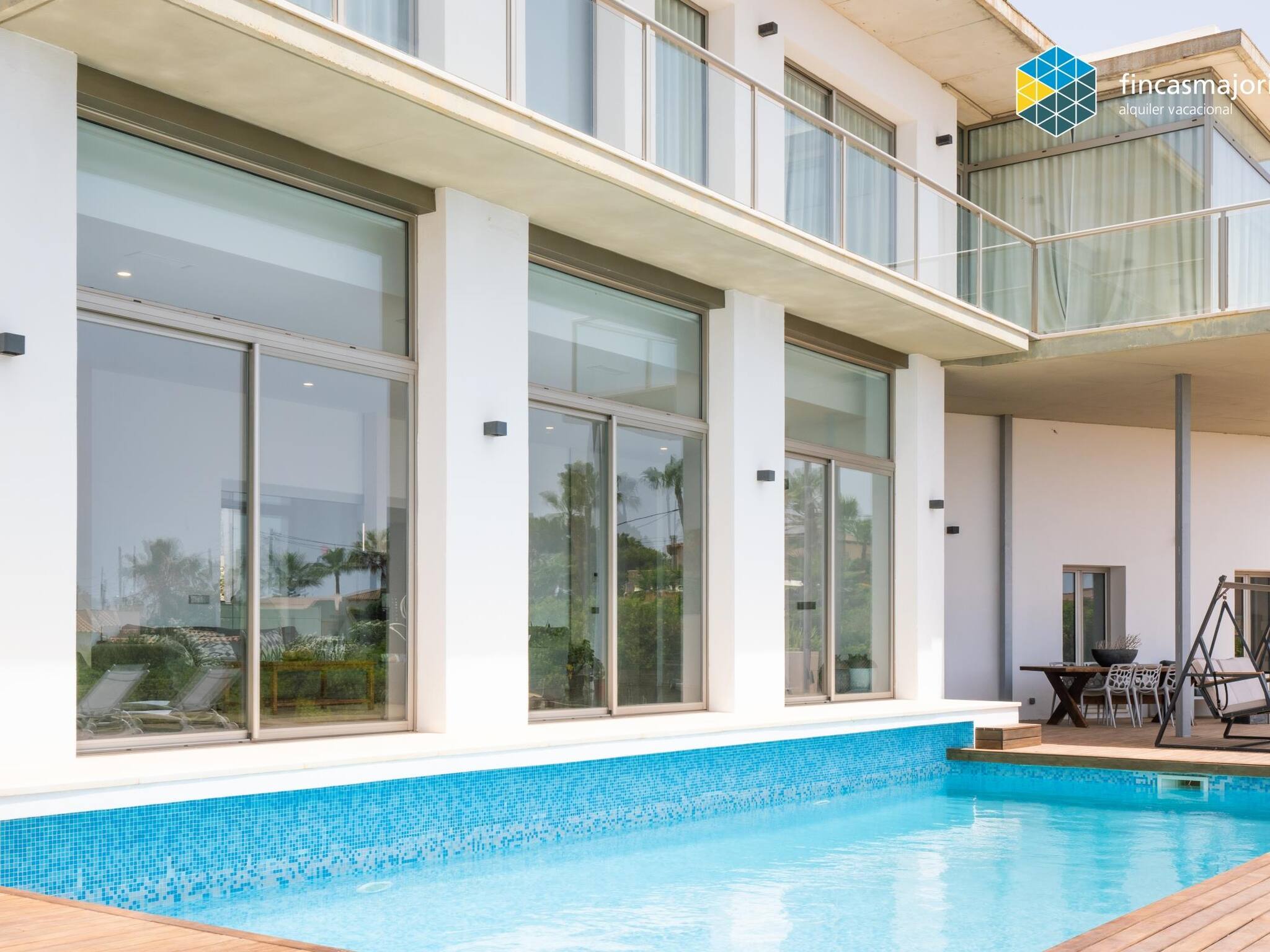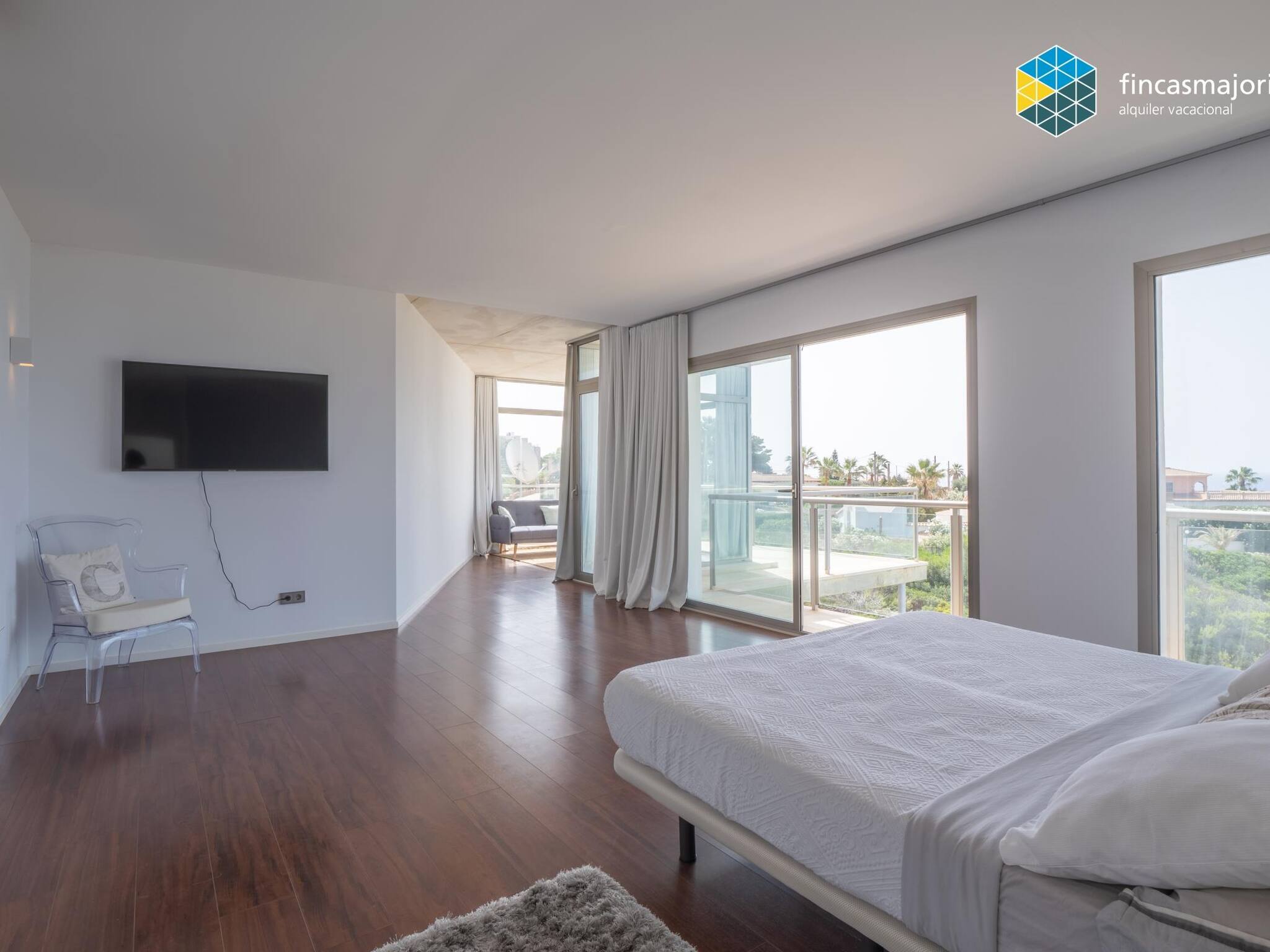 Esta fantástica villa dispone de 4 dormitorios dobles, todos ellos con baño en suite. Todos los dormitorios tienen vistas al mar, así como cortinas blackout que garantizan la más absoluta privacidad. El dormitorio principal tiene su propia sala de estar privada y cuenta con grandes ventanales que lo llenan de luz y permiten disfrutar de las relajantes vistas. Disponemos de cuna, trona y hamaca de bebé para nuestros huéspedes más jóvenes. La cocina, es amplia y luminosa y comunica con la zona de coladuría y despensa.En la terraza cubierta encontramos el comedor de verano. Junto a la piscina hay zona de hamacas y sillones de exterior.