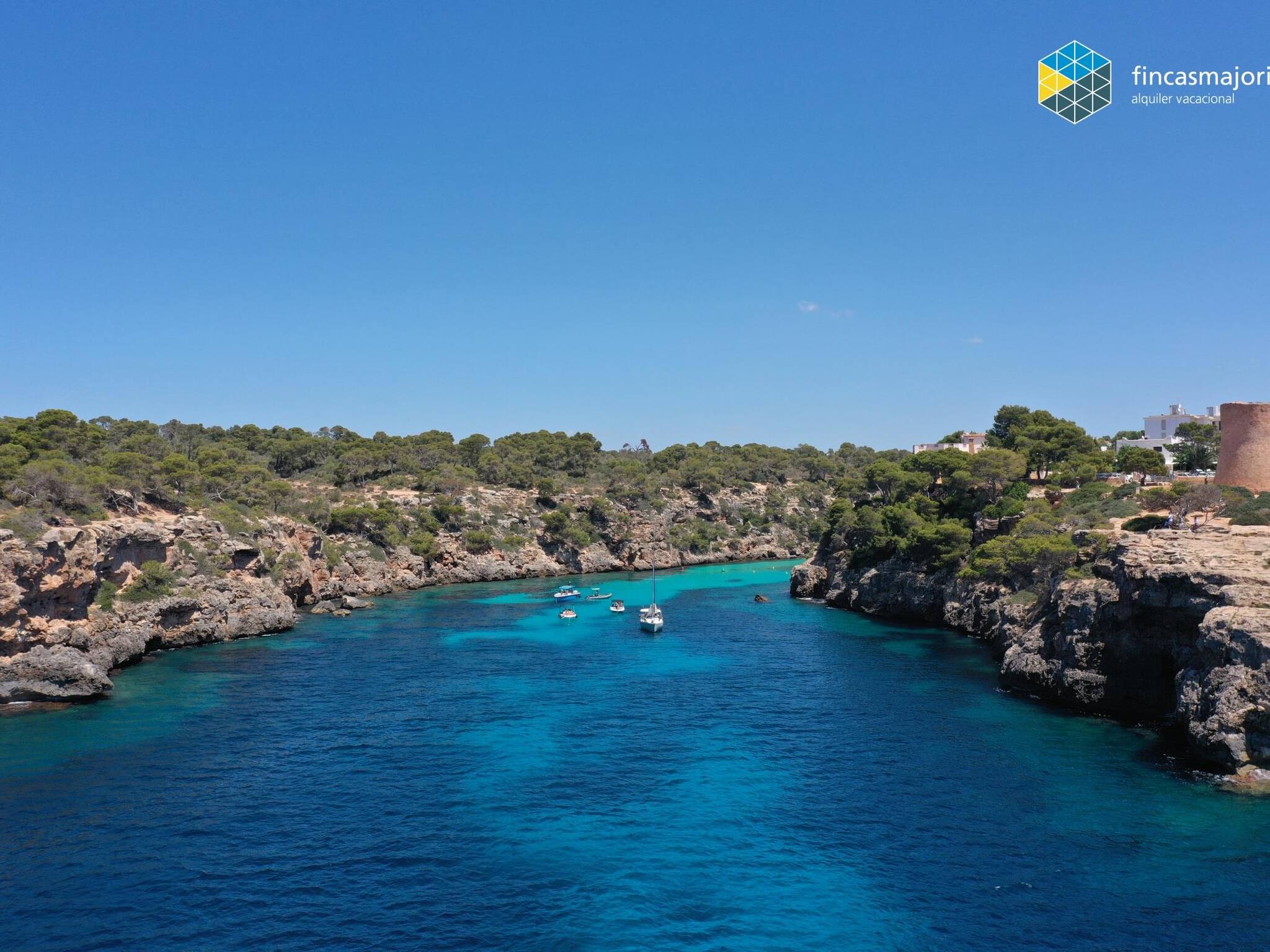 La playa de Cala Pi, situada a escasos 500 metros de la villa, está considerada por muchos como la playa perfecta, protegida entre dos acantilados, con arena dorada y aguas azul turquesa. El acceso a la playa es cómodo y se realiza por una escalinata accesible a todas las edades.