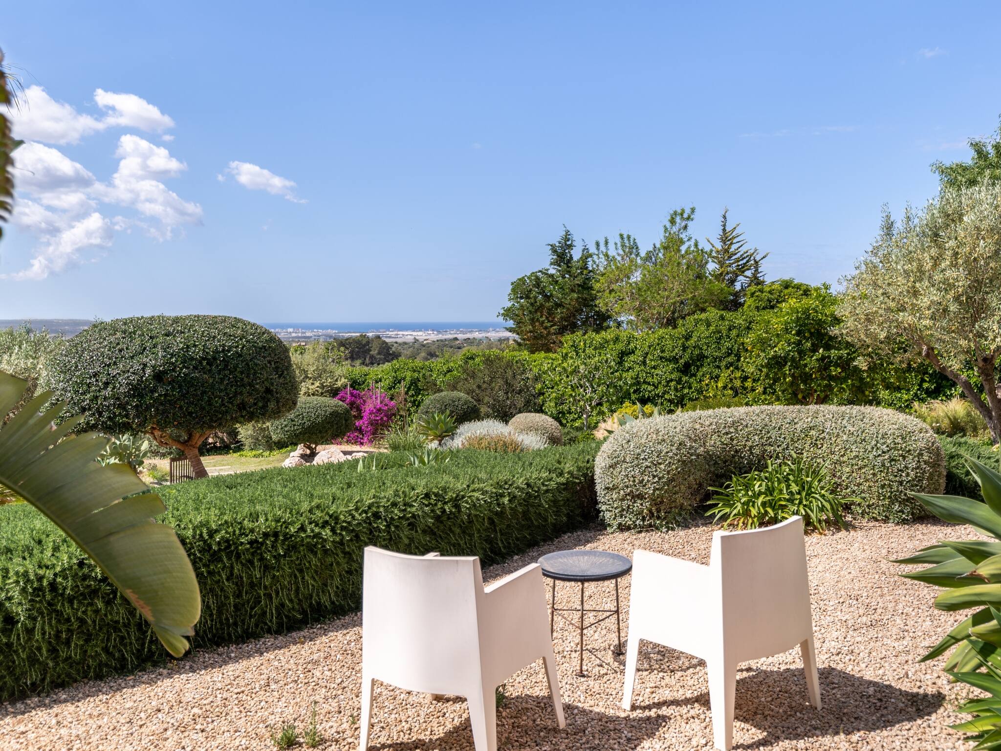 Der üppige mediterrane Garten von guter Größe bietet ausreichend Platz zur Erholung und Entspannung. Wunderbarer privater Pool mit herrlichen Ausblicken auf die Bucht von Palma. Gasgrill und auch Holzkohlegrill, Außenessbereich. Die Terrassenzone verfügt zudem über Sonnenliegen und Liegestühle.