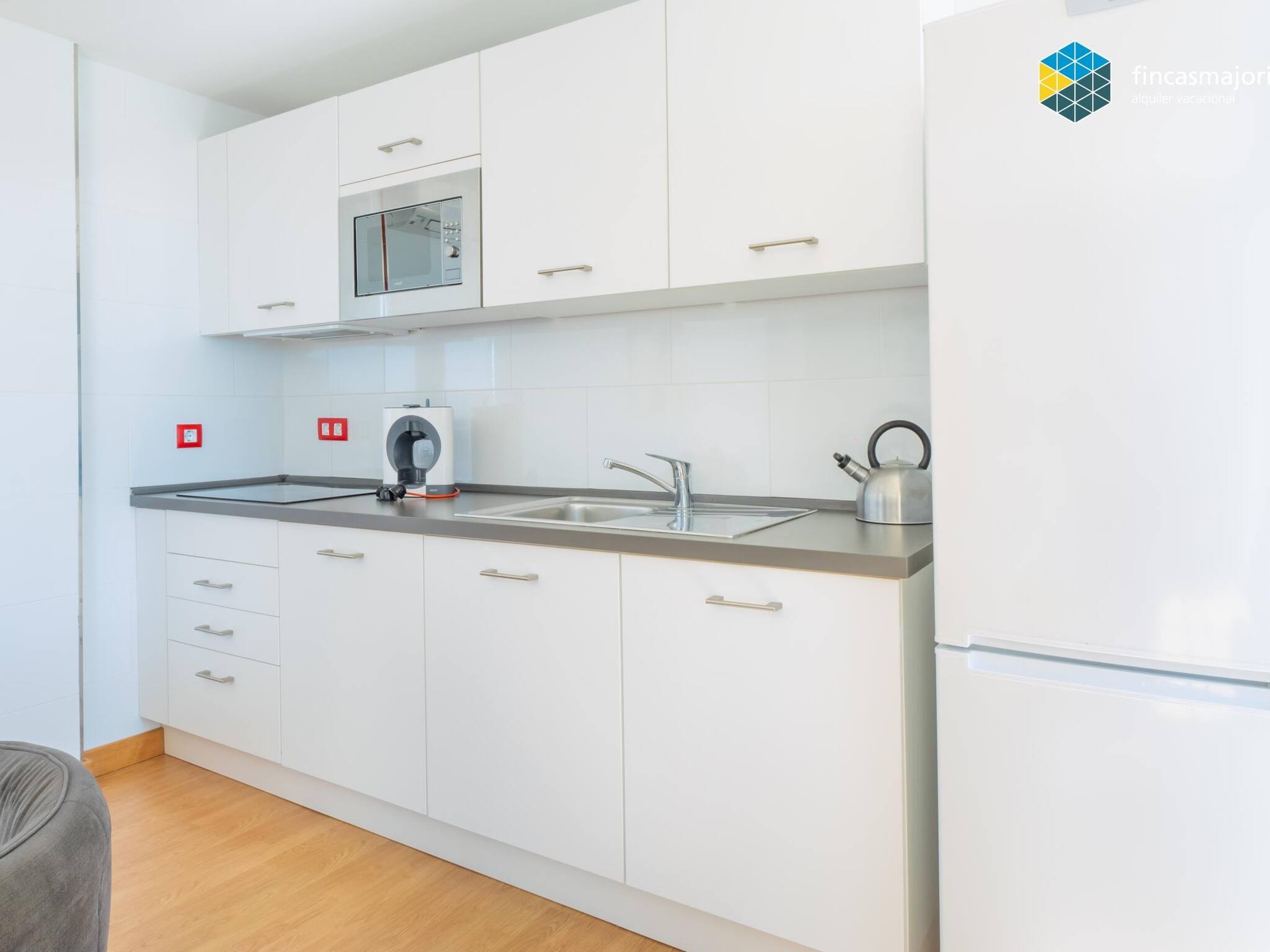 Die Offene Küche mit Ceranfeld ist ausgestattet in einen Kühlschrank, eine Mikrowelle, Gefrierschrank, Geschirr/Besteck, Kochutensilien, eine Kaffeemaschine, einen Toaster und einen Wasserkocher.