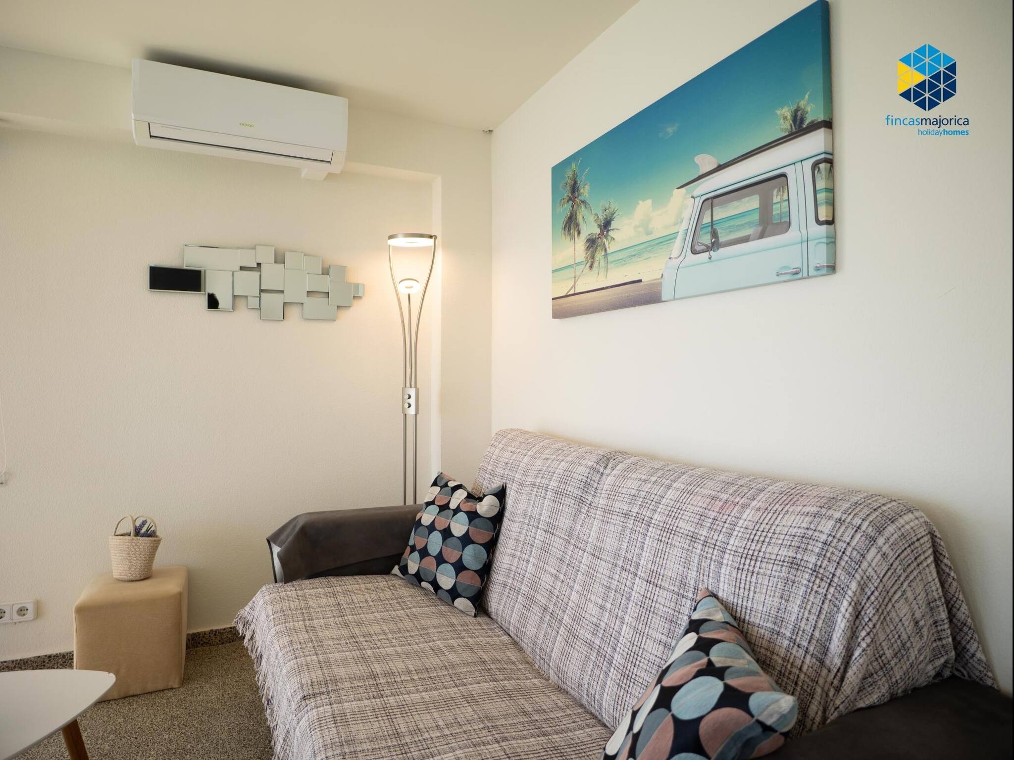 There is A/C (cold and heat) in the living room and the kitchen is fully equipped.