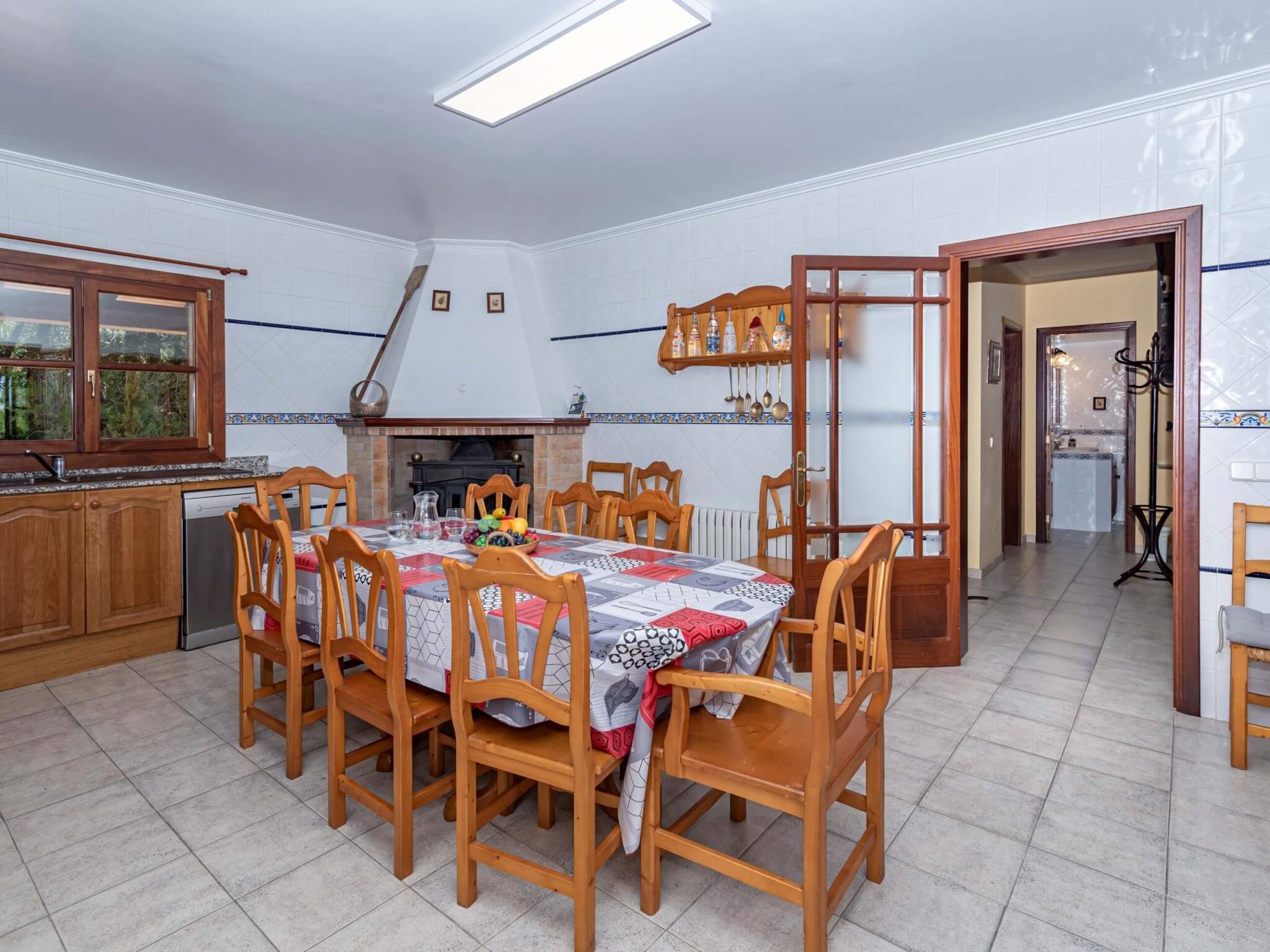 Large living room with fireplace and a large kitchen with a perfect breakfast nook. The entire property is completely fenced, making it safe for children to play on the grounds. In addition, around the pool there is also a safety barrier for small children. This property is perfect for families with children and in general for all those who want to spend a relaxed vacation.