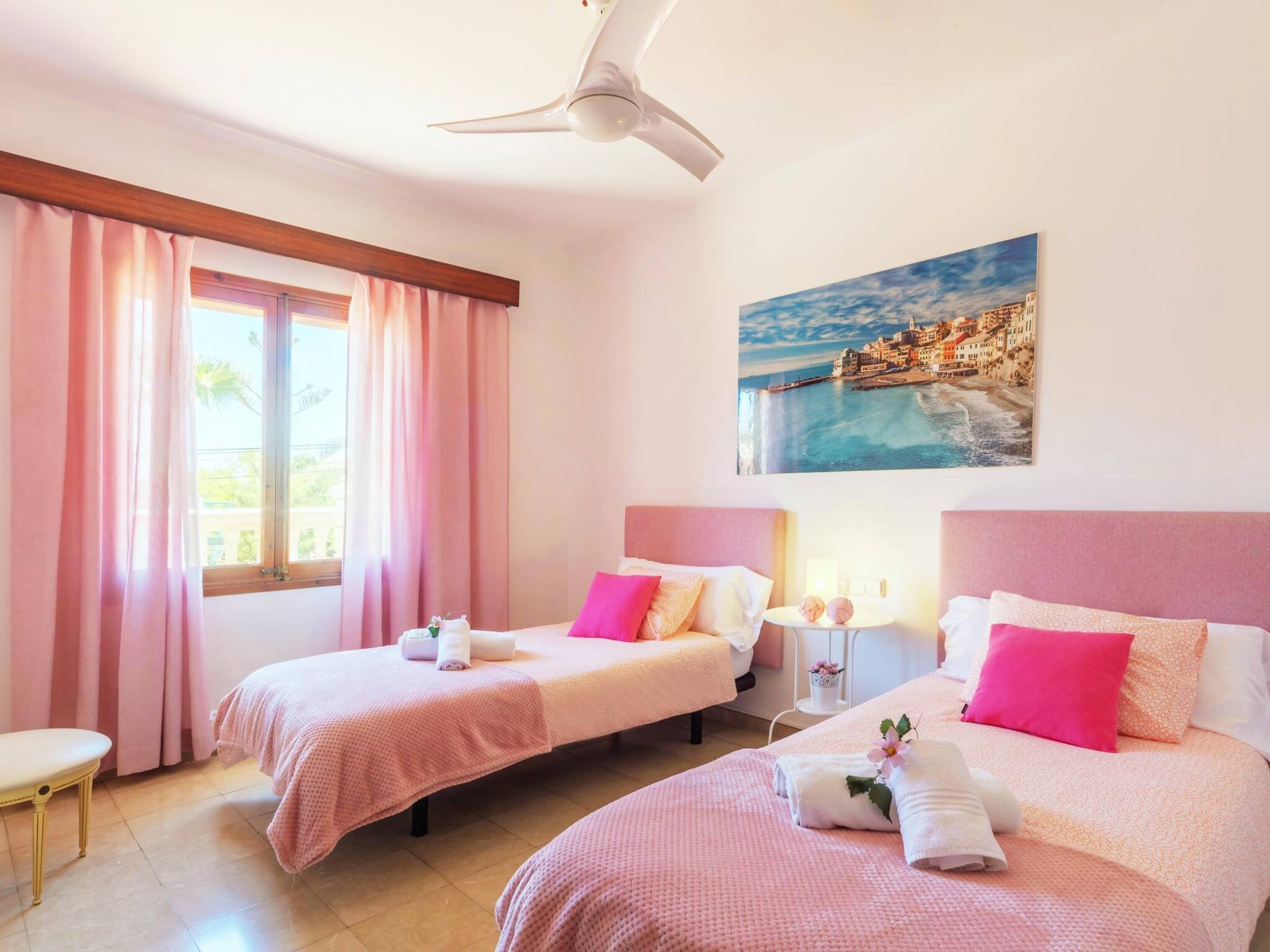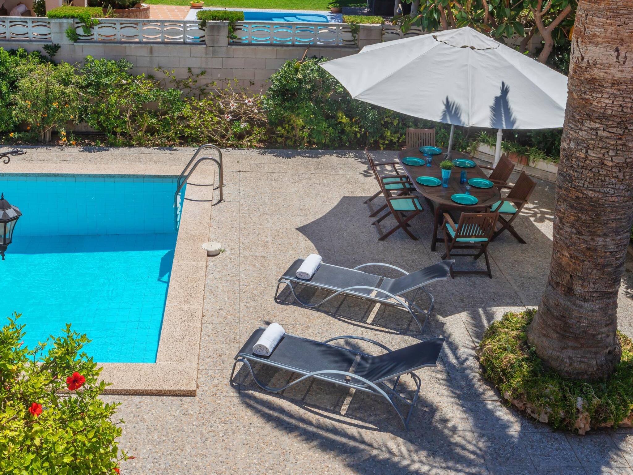 Incredible holiday home with swimming pool located in Can Pastilla, Palma. It has 4 bedrooms, 2 full bathrooms, living room, spacious terraces, swimming pool and garage for 2 cars. It is just 10 minutes walking from the beach and 5 minutes by car from the airport. Ideal for family holidays! Air conditioning in all bedrooms and living room, high-speed Internet (fibre optic) and barbecue. Cot and high chair. There are smoke detectors for your safety.