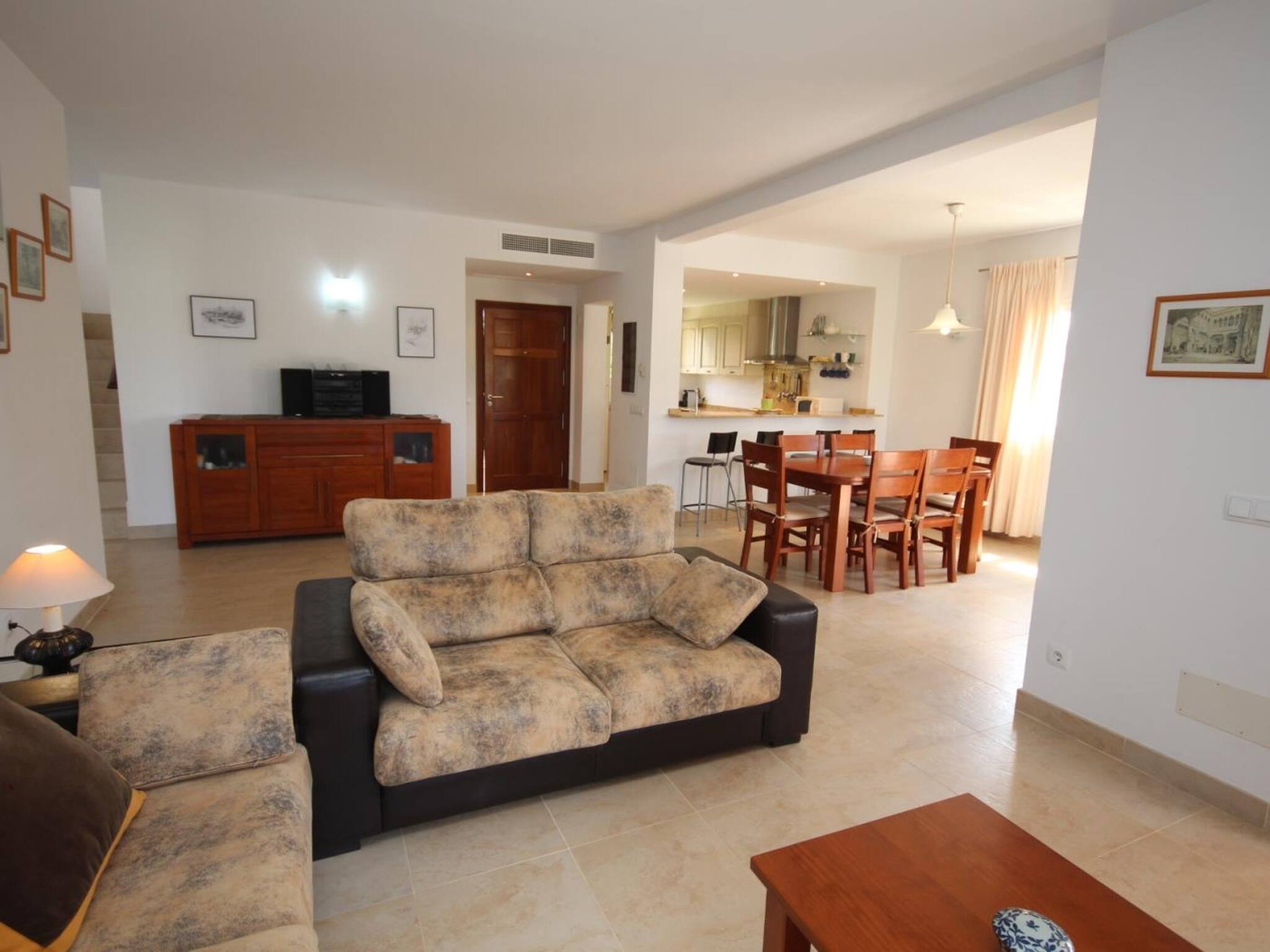 It has 3 double bedrooms (all 3 with a double bed), 3 bathrooms and 1 toilet, living room, equipped and furnished kitchen, Movistar Fiber 300MB WIFI, satellite TV, BBQ, hot and cold A/C in the living room and in the 3 bedrooms. Crib on request.